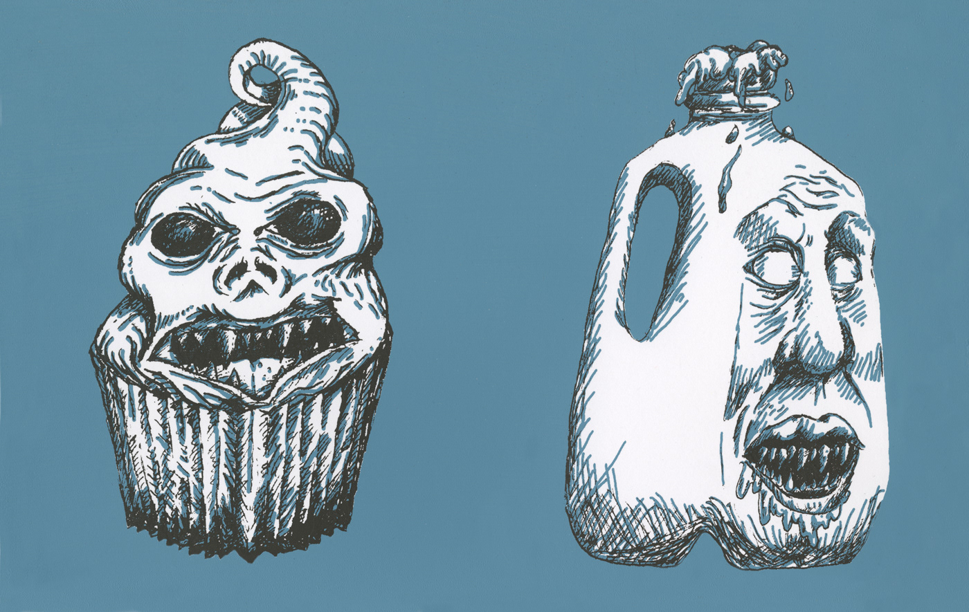 This project called for the creation of a two-color series of screen printed images depicting a nightmare of some sort. While talking to my sister about her gluten intolerance, I developed the idea of personifying foods that are commonly known to be particularly harmful to individuals with certain diseases yet harmless to others. Depicted in this image is a gluten (cupcake) monster and a milk (lactose) monster.